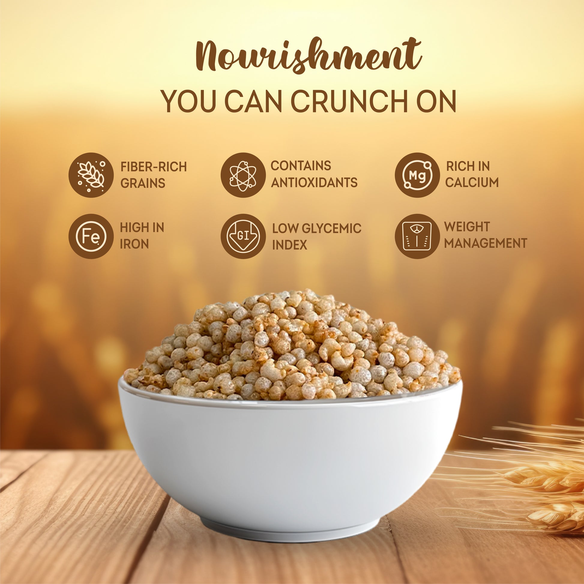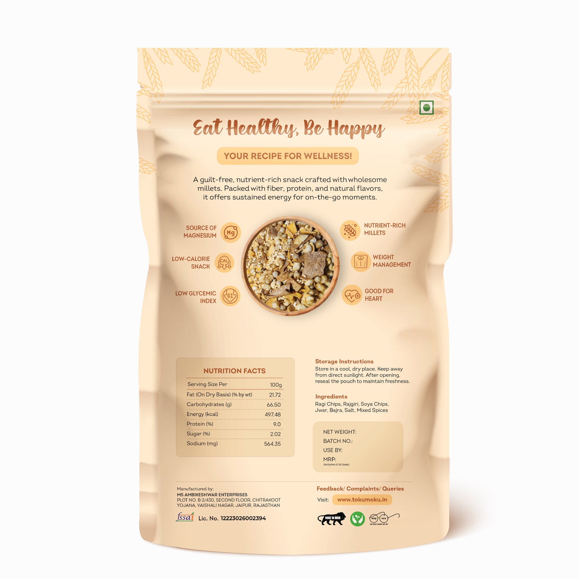 Relish this crunchy alternative Ragi namkeen to boring fried snacks such as bhujia, chips, chivda! Flavoured in delicious masala flavour this snack item is ideal for anytime snacking, adding to your kids' tiffin and the perfect diet food for weight loss, being non fried. Since it has low glycemix index and lower calories, it is the perfect healthy snack for everyone. Munch on, Crunch On Guilt Free! This multigrain mixture is made using bajra (pearl millet puffs), wheat flakes, peanuts, moong & jowar flakes - truly making it a wholesome namkeen! It is your ideal diet snack; add it to your salads to make boring healthy food delightful & interesting. Serve it to your guests as a farsan namkeen and watch them munch on in delight!